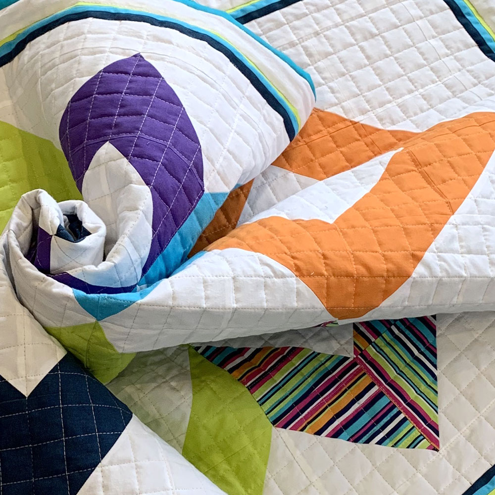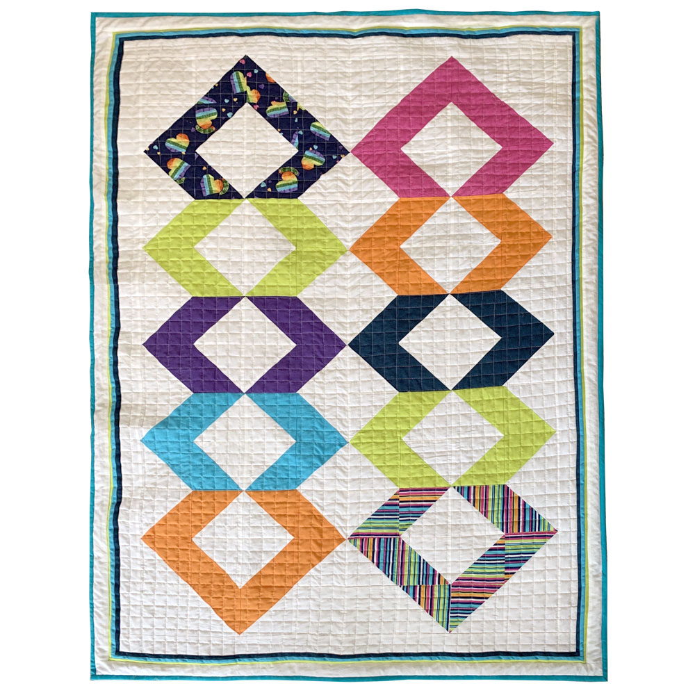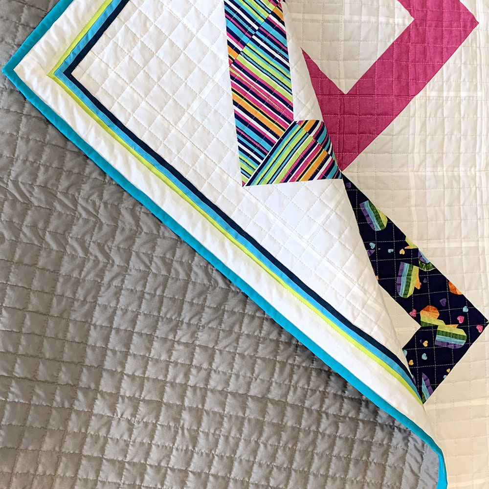 A Crib size quilt, with a bright solid colours and prints and quilted with simple square crosshatch stitch lines that give the quilt a fresh and modern feel.