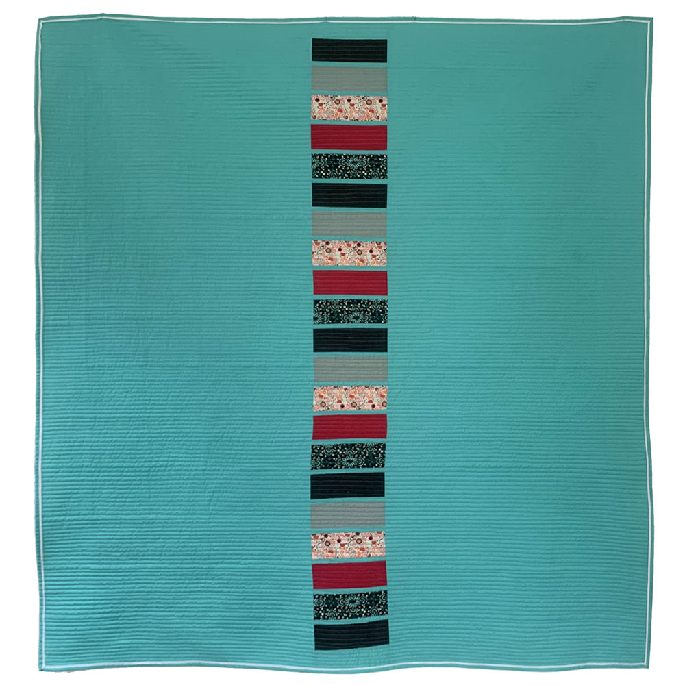 A beautiful modern lap quilt, showcasing striking and contrasting solid colours and prints and quilted with contemporary straight lines. Perfect for snuggling on the sofa under.